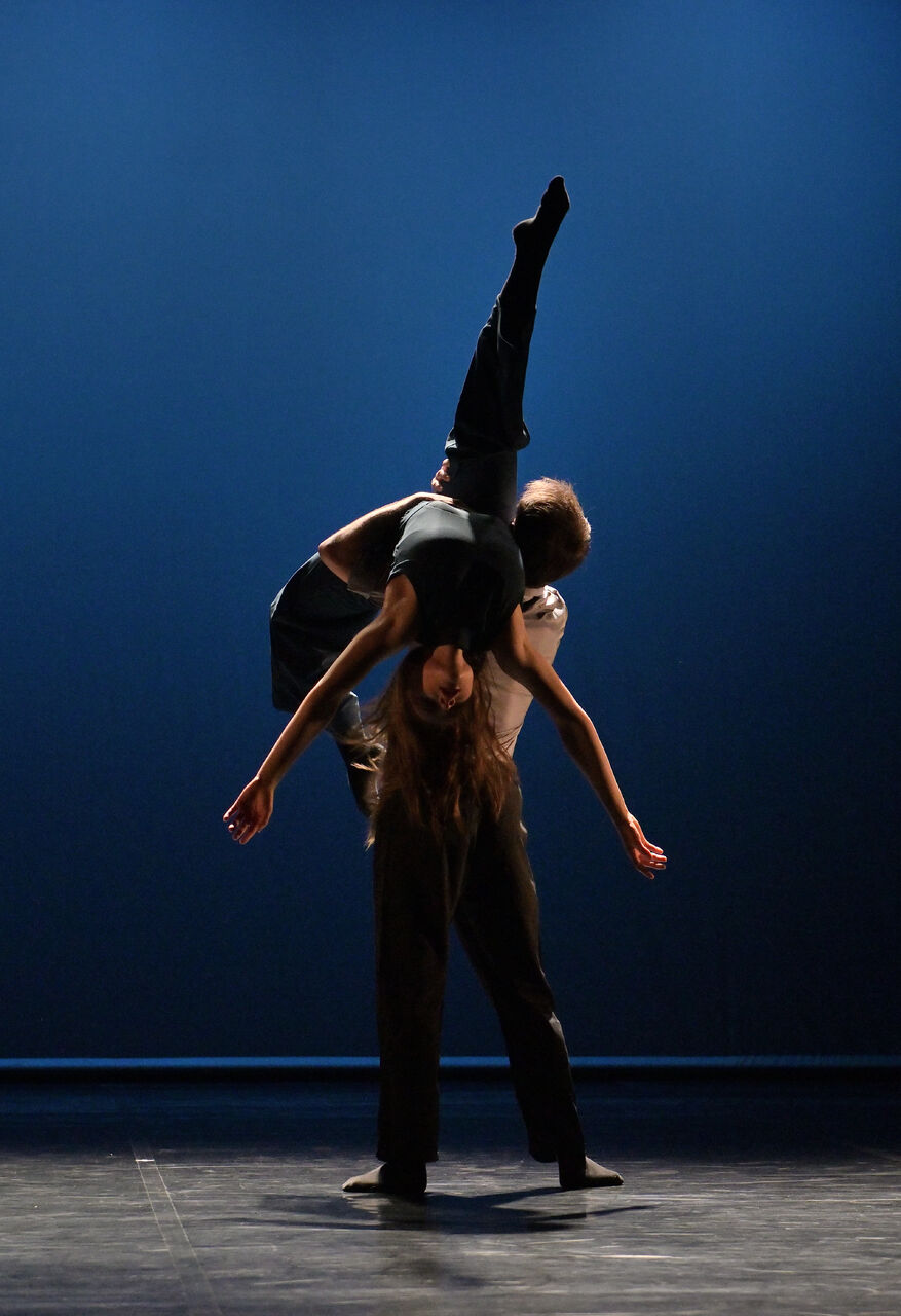 Druhou v pořadí byla choreografie Tethered Paths (Spletité cesty) německého choreografa Paula Julia, který pro soubor v minulosti již vytvořil Fragile Beziehungen (Křehké vztahy) uvedené v rámci programu Kontrasty (recenze zde). Spletité cesty po krátké přestávce navazují v lecčems na předcházející dění. Pozadí blackboxu tentokrát doplňuje modře nasvícená cykloráma, využitá hned v úvodní scéně pro stínohru, na níž se objevují siluety čtyř tanečnic. Zachovává se barevnost kostýmů, jedno telefonní sluchátko i charakter taneční promluvy.