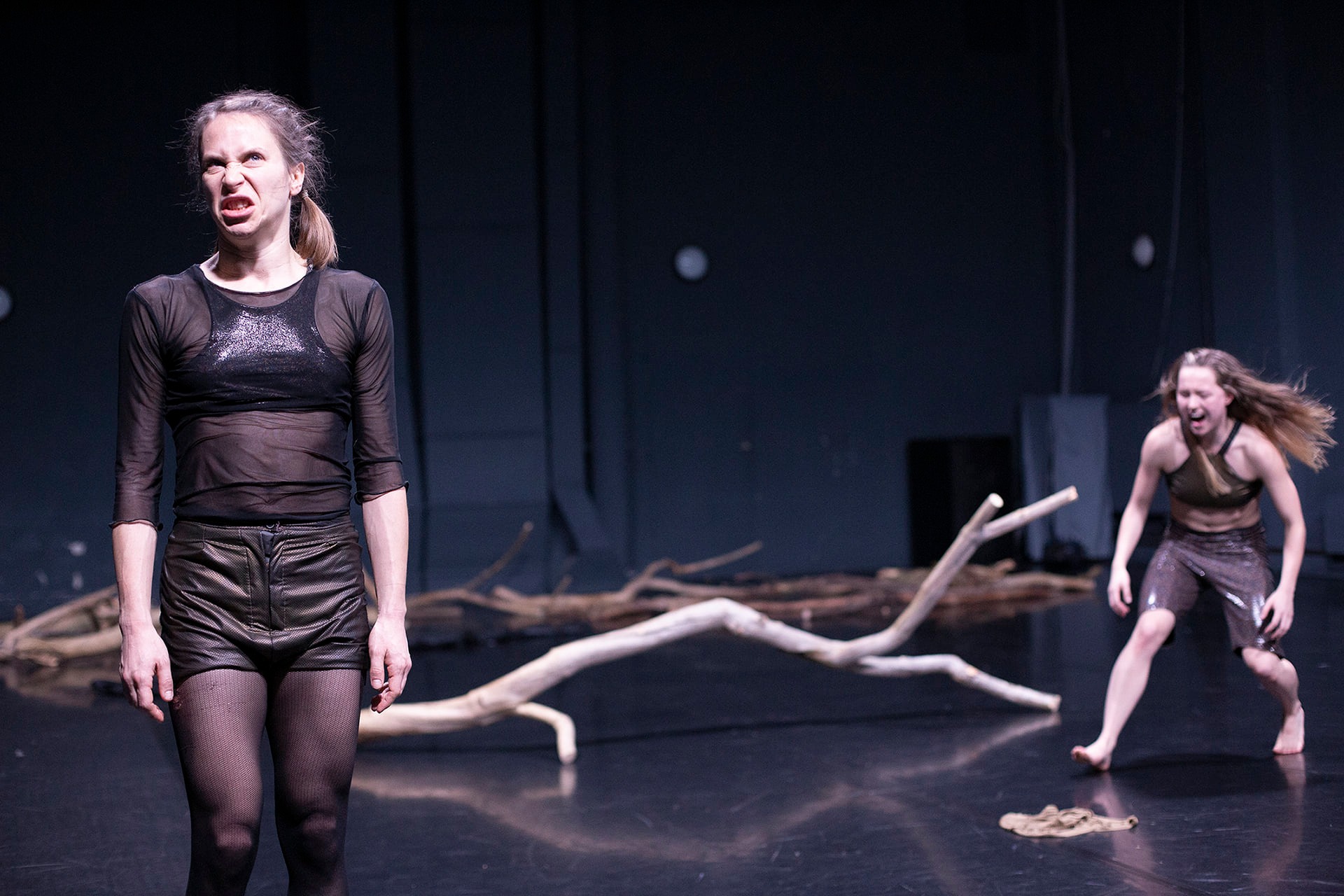 Žádné z aktérek přitom nejde vidět do tváře, pohybují se v pološeru, přičemž čas od času se asi na půl vteřiny celá scéna rozsvítí červenou barvou. Intenzita a dravost pohybů se postupně stupňuje a interpretky sebou zmítají a větví se zbavují. Pro diváka je to chvíli zvláštní – již si zvykl sledovat tělo, které má místo rukou a nohou nepohyblivé větve.