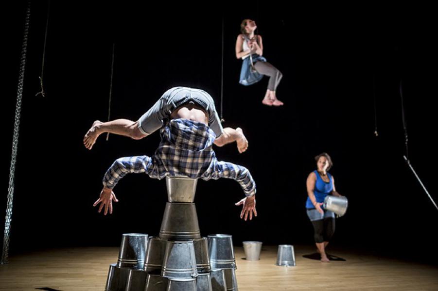 Tematicky sjednocujícím prvkem ovšem není pouze kov, ale především lidská hravost, jež je právě prvním impulzem, jak na věci pohlížet z úplně jiného úhlu. Tři performeři (Eliška Brtnická, Stéphanie N’Duhirahe, Josef Toman) se setkávají jako nerozluční přátelé a rozehrávají rozpustilé minietudy, které je vedou k hravému využívání prostoru a přítomných předmětů. Prskají na sebe vodu, navzájem se škádlí a dámská přesila velmi často provokuje svůj jediný mužský protějšek. Tyto výjevy jsou i hnacím mechanismem, který plynule posouvá představení od jednoho výstupu k dalšímu. Nevytrácí se však ani při akrobacii – přesto, že jsou účinkující především vzdušní akrobaté, zaměřili se v inscenaci hlavně na párovou pozemní akrobacii a hand balancing – souhra všech je tedy nezbytným komponentem představení.