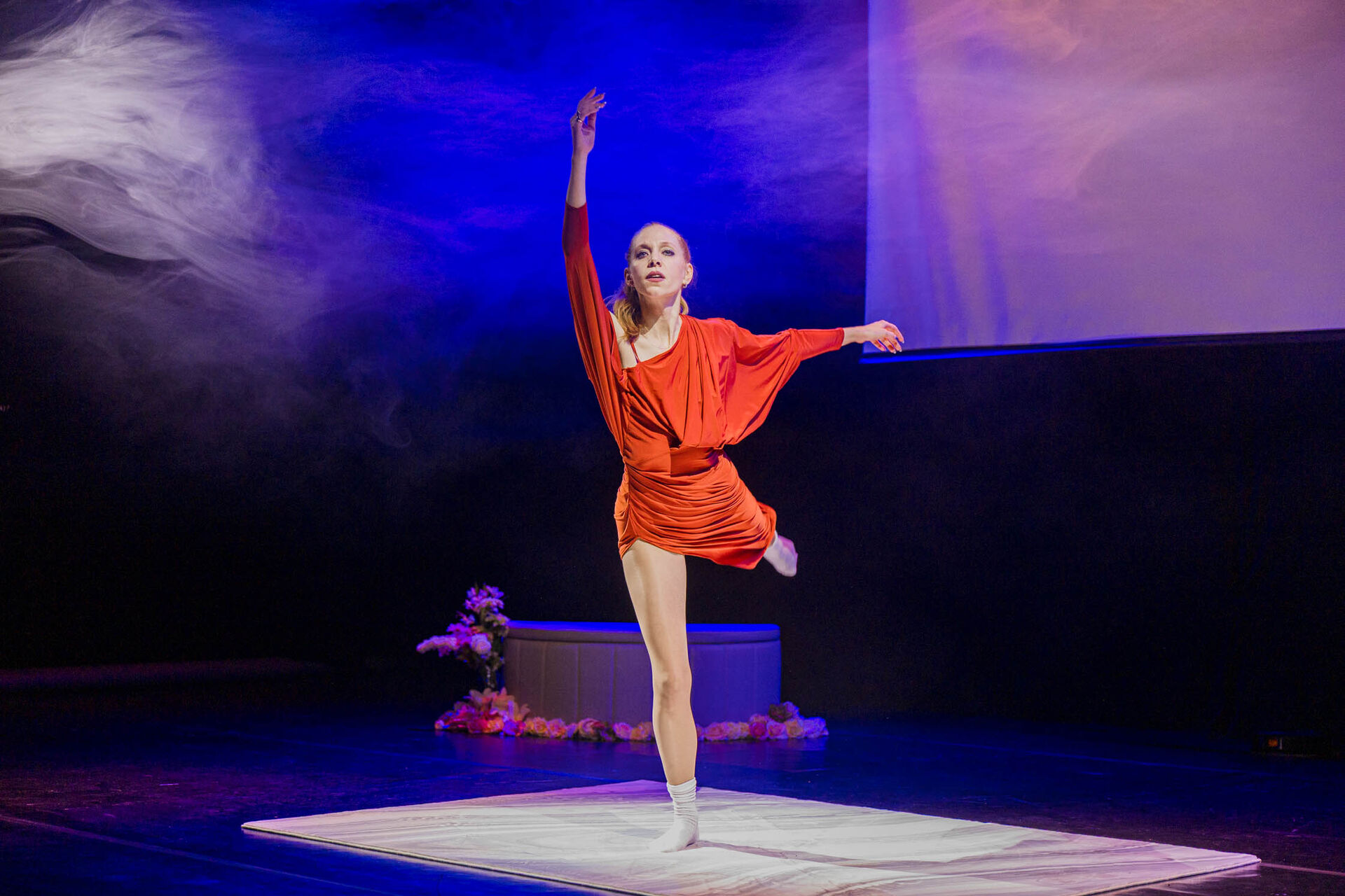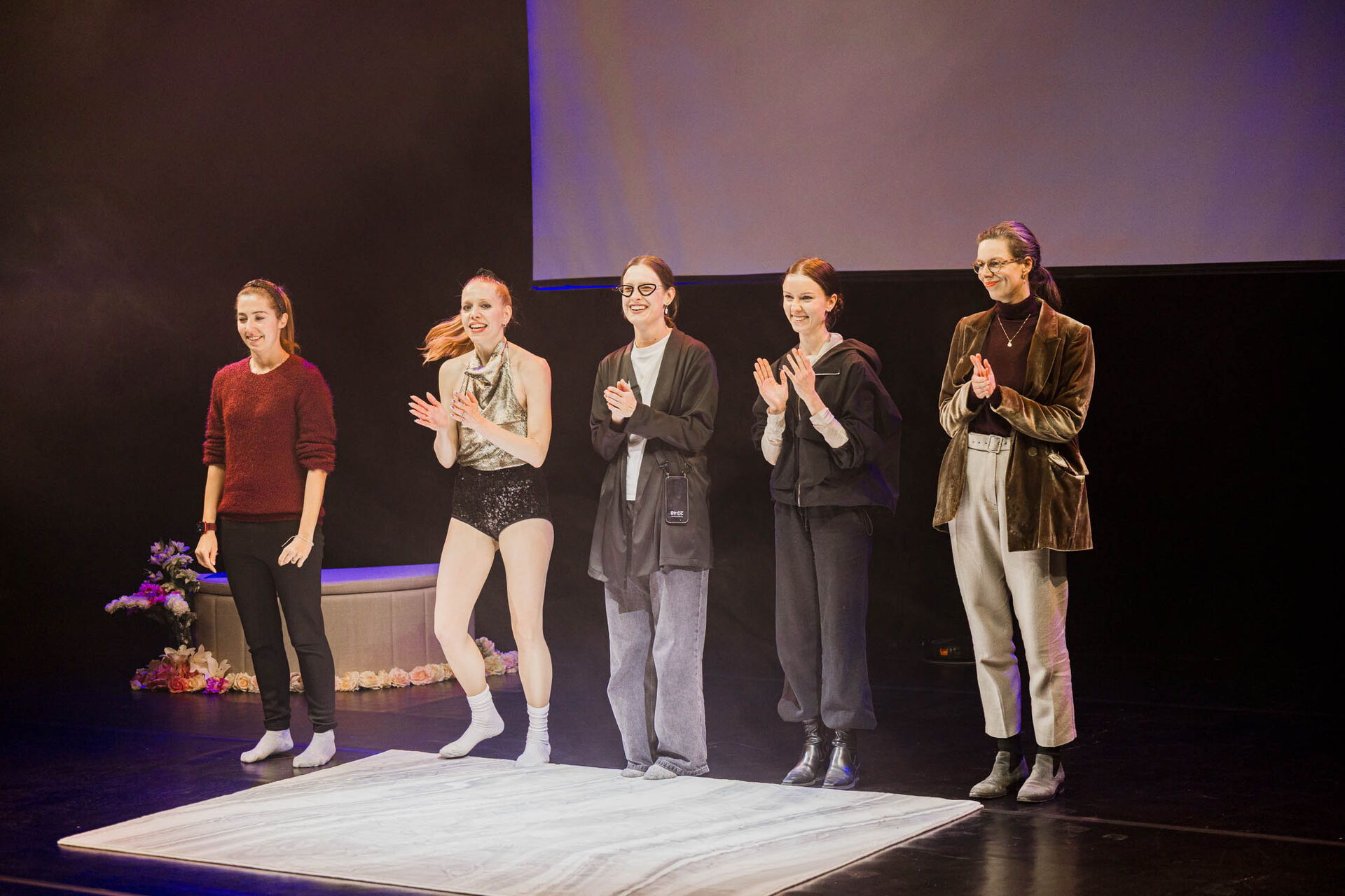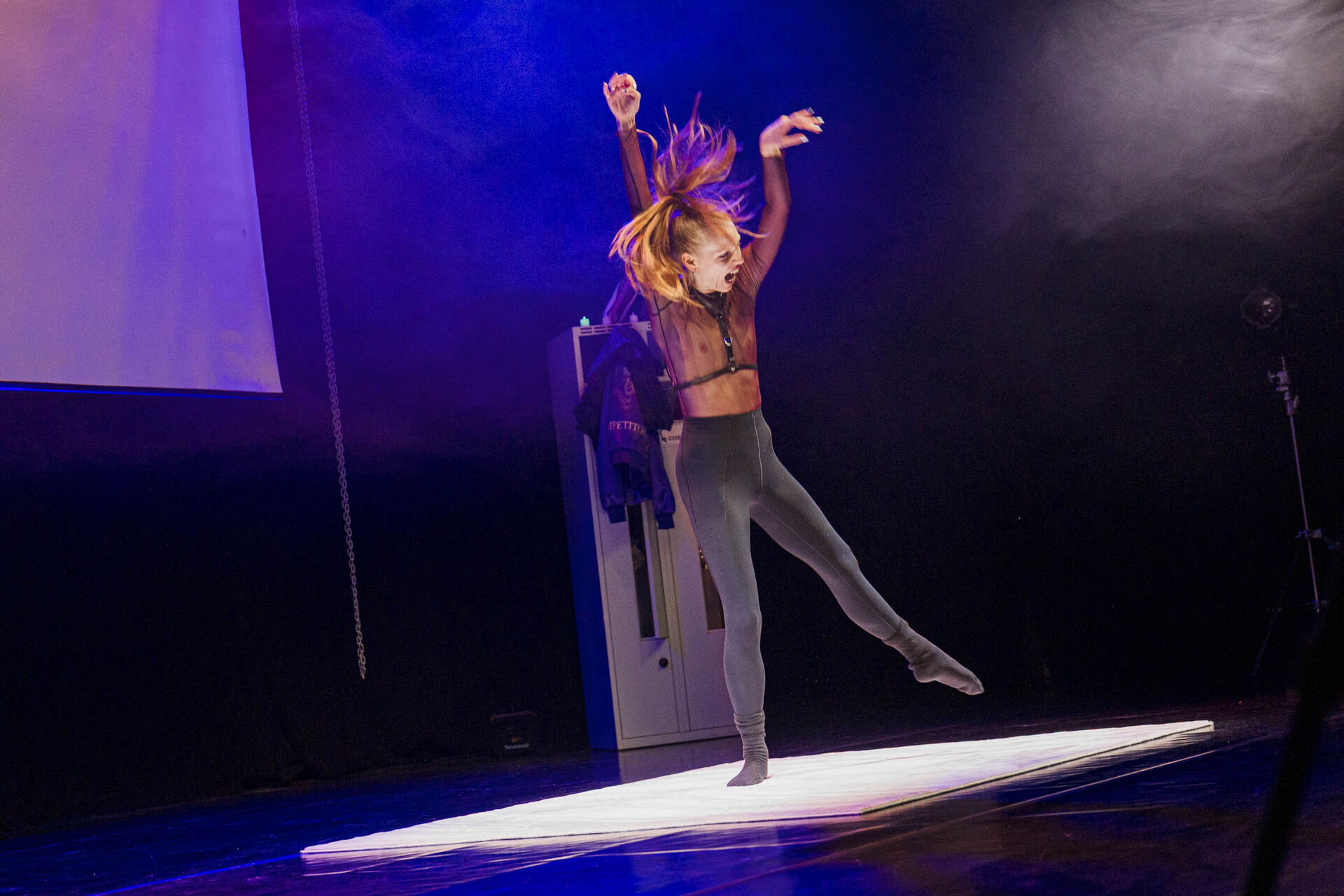 Kluziště zde symbolizuje pouze malý bílý koberec uprostřed jeviště, na kterém performerka klouže v tlustých bílých ponožkách. Ty vytvářejí groteskní kontrast k honosně třpytivým kostýmům.