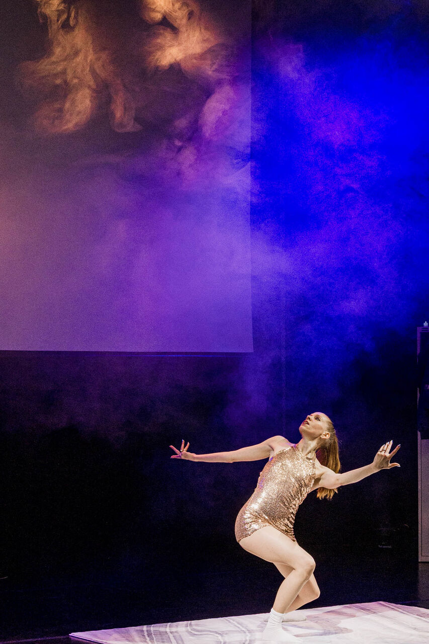 McFadden průběžně z kovové šatní skříňky vybírá různé kostýmy a převléká se do černých tepláků, krasobruslařských šatů s flitry či do průhledného body s koženými popruhy a provokativně erotickým nádechem. Kluziště zde symbolizuje pouze malý bílý koberec uprostřed jeviště, na kterém se performerka prohání v tlustých bílých ponožkách. Ty vytvářejí groteskní kontrast k honosně třpytivým kostýmům. Podobnými komickými a sebeironickými prvky je důmyslně protkaná celá inscenace, například když po „krasobruslařském“ výstupu přijede uhladit rozcuchaný koberec robotický vysavač, připomínající miniaturní rolbu na ledovou plochu.