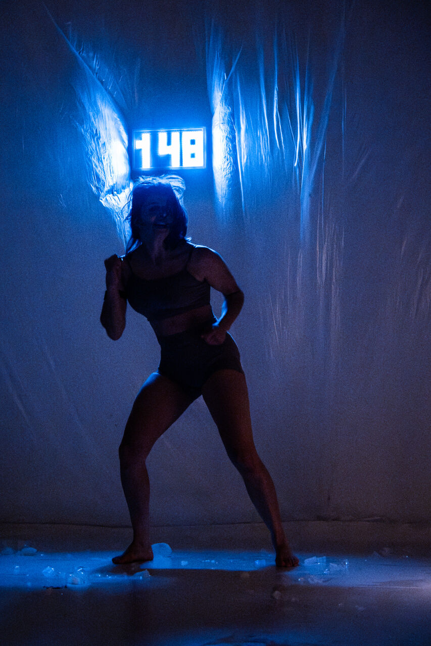 Příval energie odstartuje Tichá kladivem, kterým rozmlátí kvádr ledu. I když se performerka téměř celou dobu směje, scéna působí brutálně. Po kvádru zbude jen drť a na nohou malé krvavé rány od ostrého ledu. Mezi ledovou tříští je ukryt pytlíček s červenou látkou. Dostali jsme se skrze led až k srdci? Přibližně ve stejný moment se v zadní části herního prostoru začne promítat číslo, které ukazuje srdeční tep performerky. Problikávající číselná data vnáší zcela jinou dynamiku. Vědomou prací s gamifikací, tedy herním principem v neherním prostředí, zvyšují tvůrci angažovanost všech diváků. Naplno tento motiv vytěží ve scéně, kdy se performerka schválně snaží dostat svůj tep na maximální hodnotu. Celá tato zběsilá sekvence je podpořena gongem (jako v boxerském zápase), který ohlašuje nárůst o deset tepů za minutu.