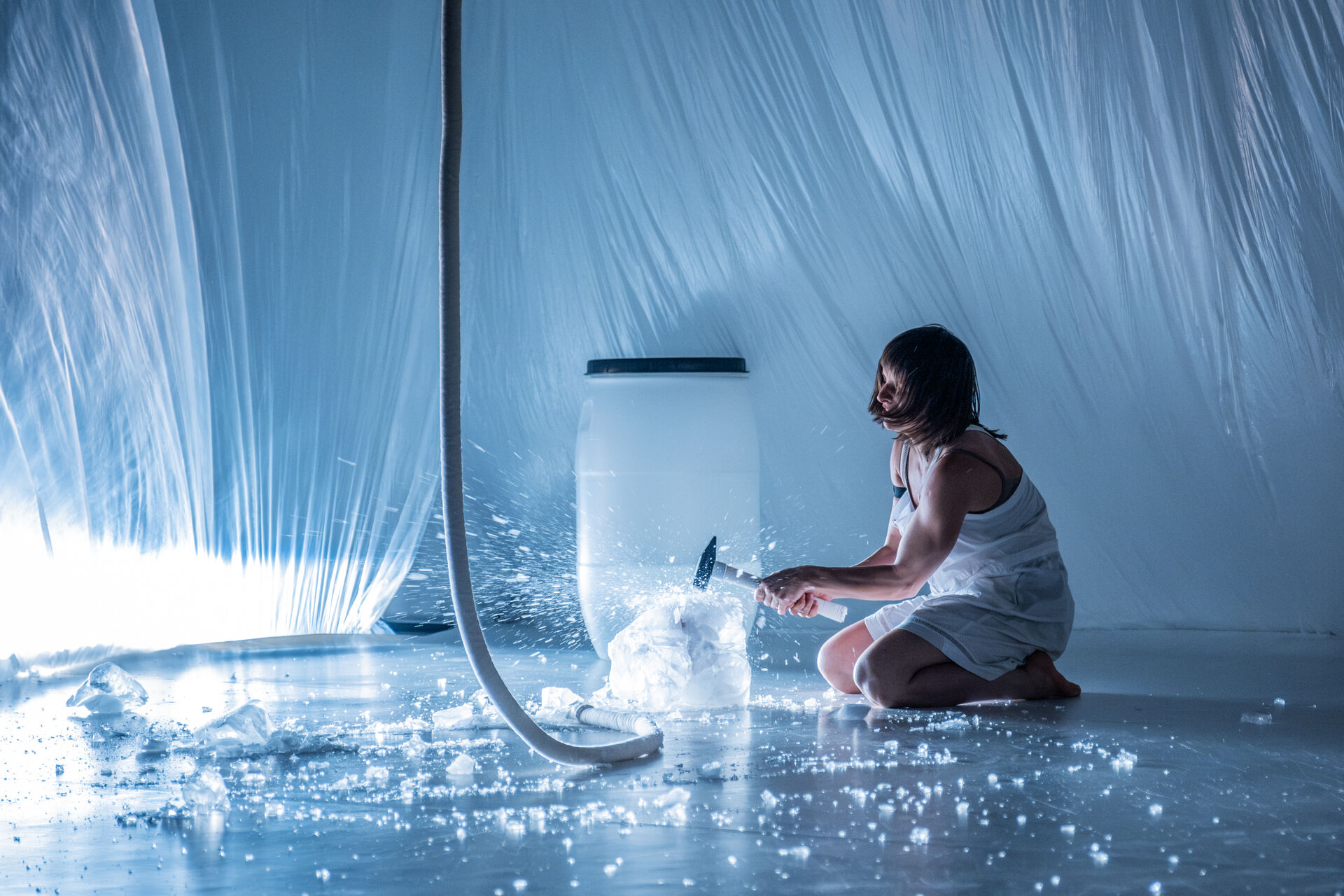 I když Frekvence není primárně postavená na příběhu, obsahuje dramatický oblouk. Pytlíček s červenou látkou (srdcem), se na konci i s performerkou ponoří zpět do barelu plného ledové vody. Tep se sníží, všechno se zase zastaví.