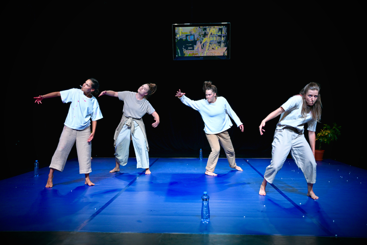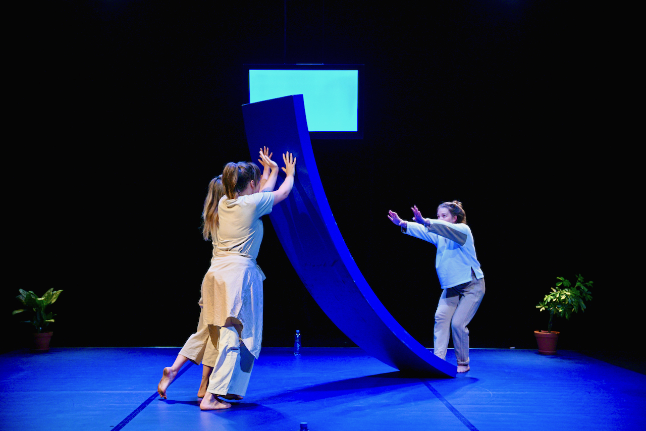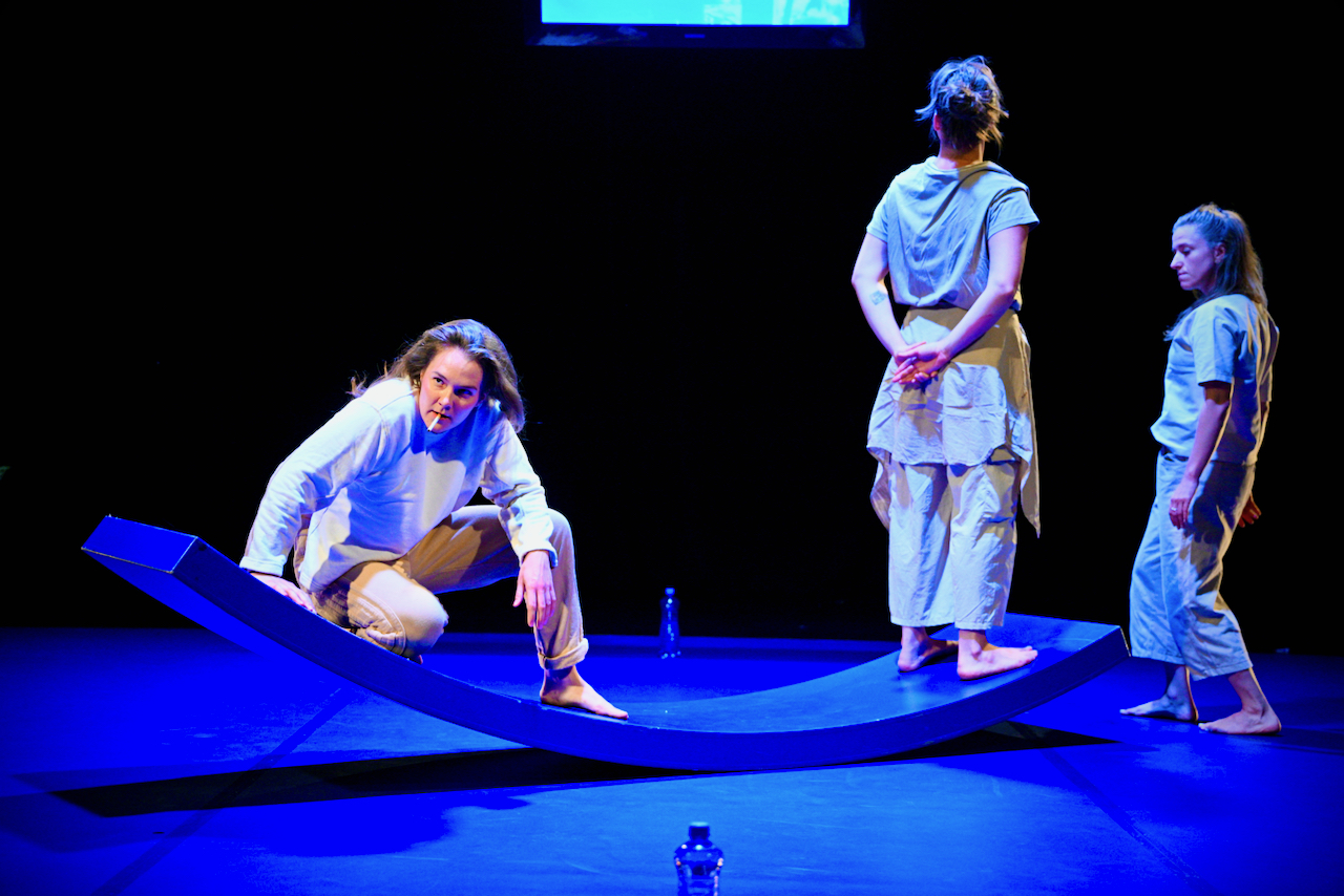 Odlehčení přináší až změna dynamiky a příslib využití potenciálu scény. Té dominuje tmavě modrý baletizol a modrý objekt, který evokuje dětskou montessori houpačku. V zadní části scény pak visí také středně velká obrazovka. Houpačka vzbuzuje velké očekávání. I jevištní akce tomuto očekávání pomáhá. Performerky kolem objektu krouží, vylézají na něj, začínají se houpat. Pak ale akce najednou skončí, objekt performerky odnášejí a již se neobjeví.
