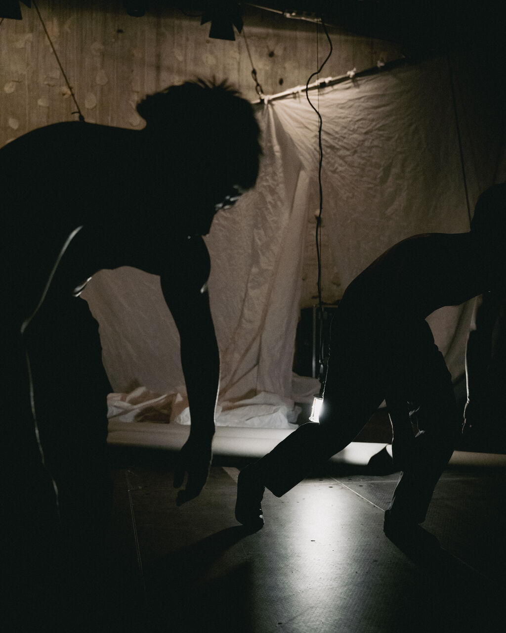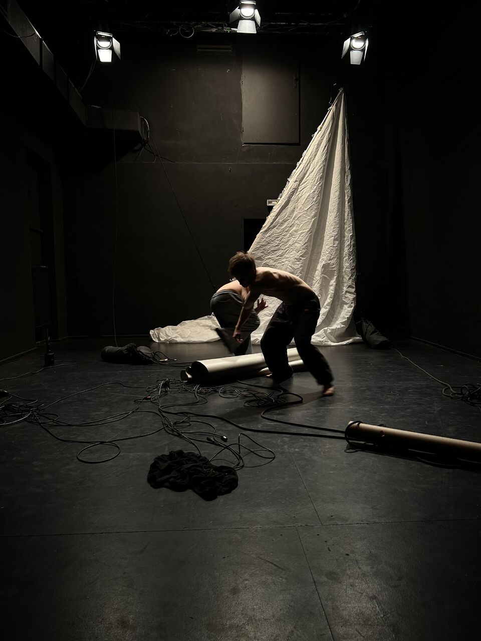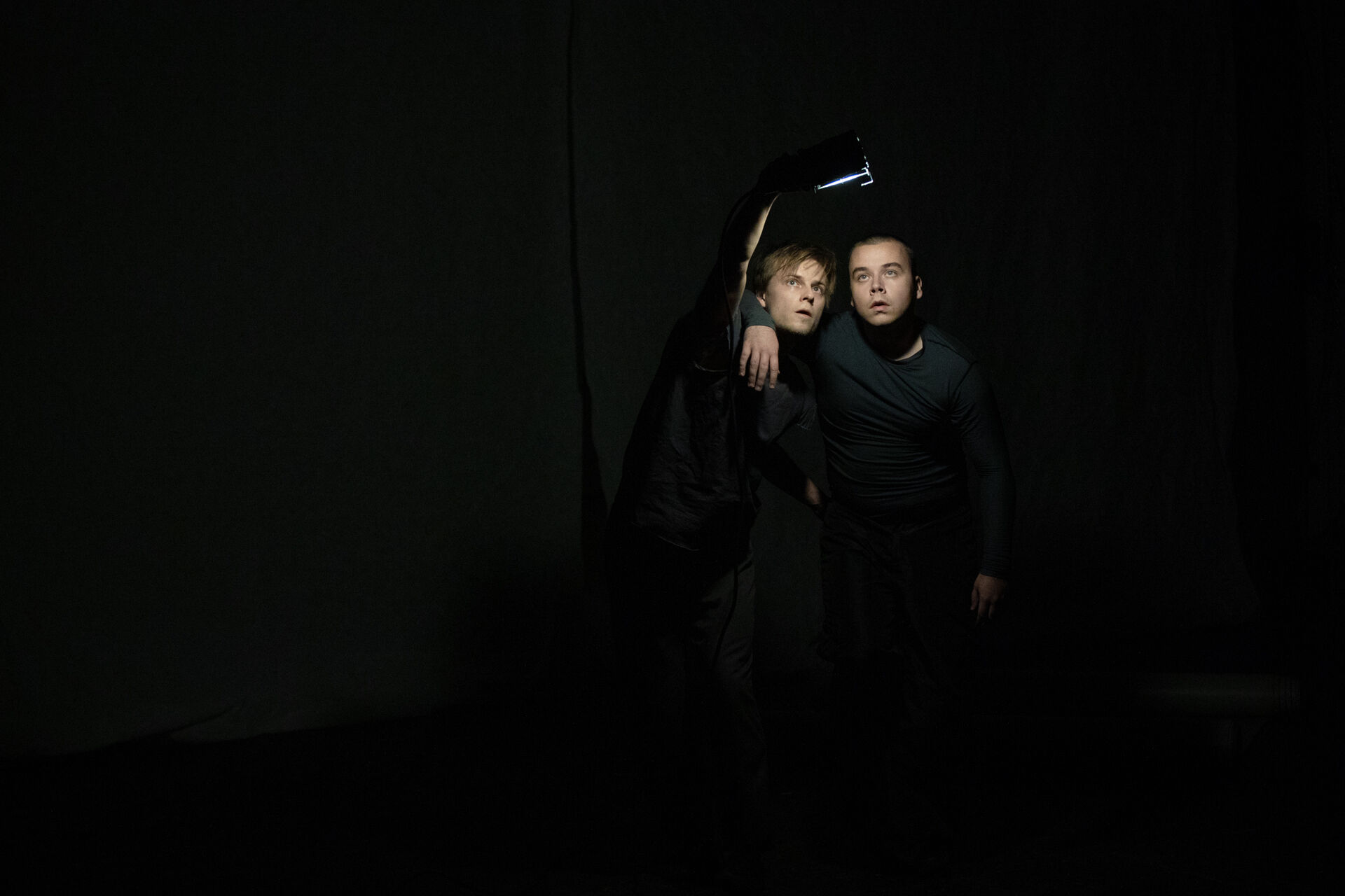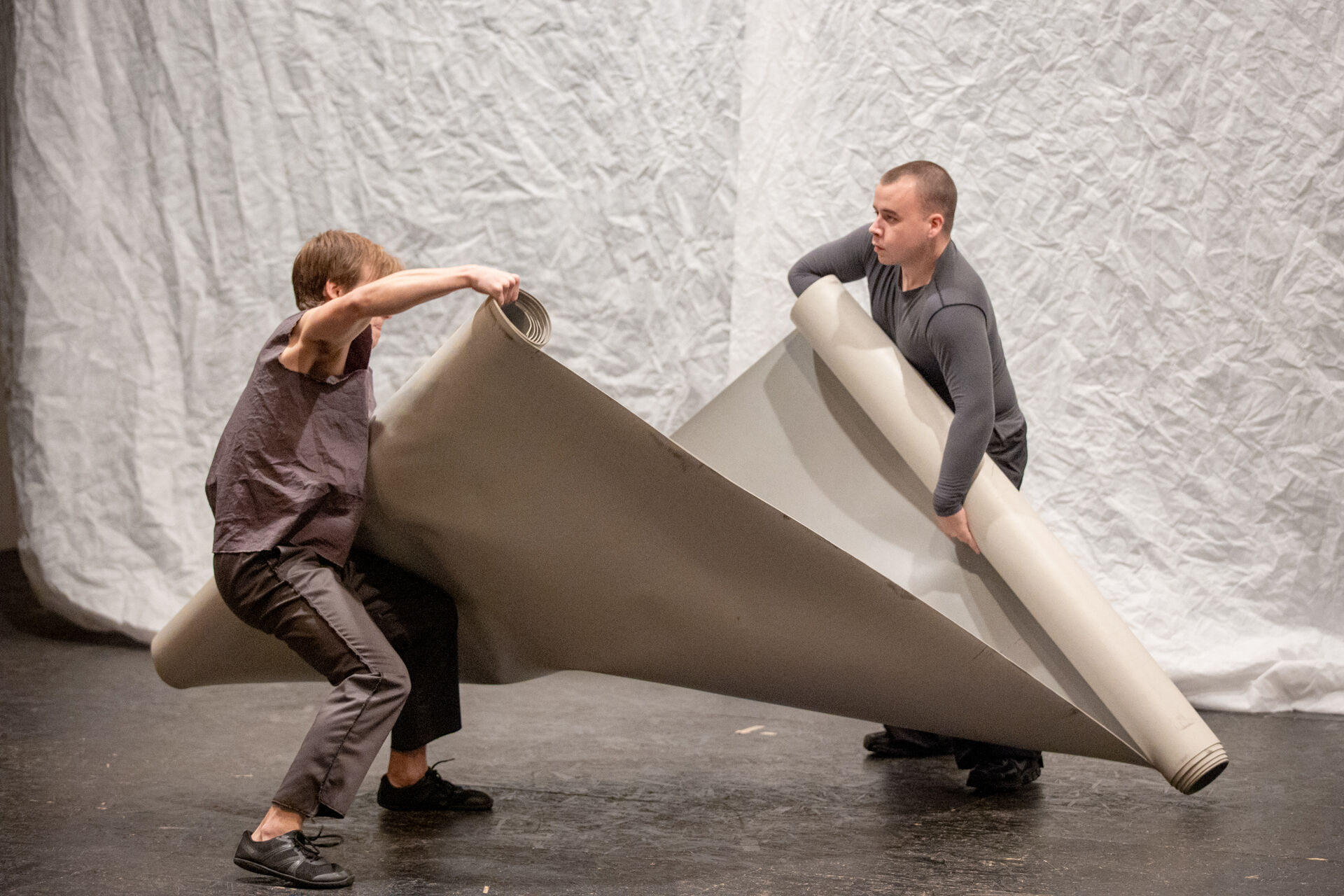 Hned na první dobrou evokují Adam Kmenta a David Králík uhlazené verze Pata a Mata generace Z. Bez proslulých čepiček a roláků, jen ve funkčních tričkách a teplákách tmavých odstínů, vítají diváky vlídným slovem a nataženou pravicí. Tu ale podobnost ústřední dvojice s karikaturními kutily nekončí. Právě jejich tanečně-divadelní hašteření je pilířem intimního „pas de deux“ o třech jednáních, jako stvořeného pro betonové přítmí sálu Kulturní stanice Galaxie. Evidentní, a přitom nevtíravý leitmotiv stavby, či přesněji zařizování společného prostoru, který tanečníci obývají, poskytuje nosný vypravěčský rámec. A hlavně vtipnou metaforu. Světlé, pomuchlané záclony na pozadí vytvářejí tolik potřebný kontrast k minimalismu kostýmů Hany Frišonsové a nechávají vyniknout všechny detaily obdobně minimalistické choreografie. Volně ložené kabely, dílenská lampa či smotaná role neznámého materiálu pak slouží jako záminky k přátelskému konfliktu, jenž postupně přerůstá v souboj vůlí i těl.