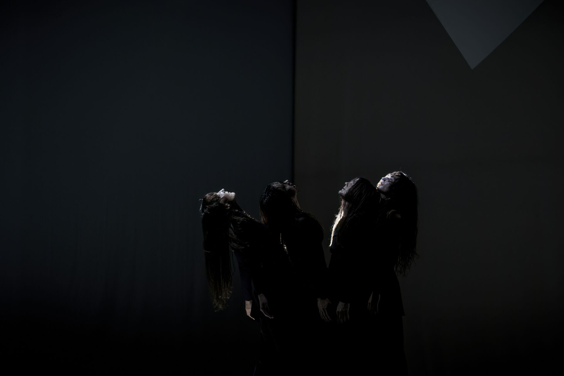 Již při vpouštění publika do sálu stojí ve světlém prostoru čtyři ženy v černých topech a minimalistických sukních a širokých kalhotách stejné barvy. Zády k nám tvoří diagonálu a trpělivě v ní setrvávají. Nad nimi visí různě velké plochy z látky, plastu i dřeva, jeviště je ze stran celé obaleno velkým bílým pláštěm a ihned tak získávám pocit, že se nacházím v příjemném, od reality odstřiženém kosmu, a v bezčasí plném očekávání a objevování.