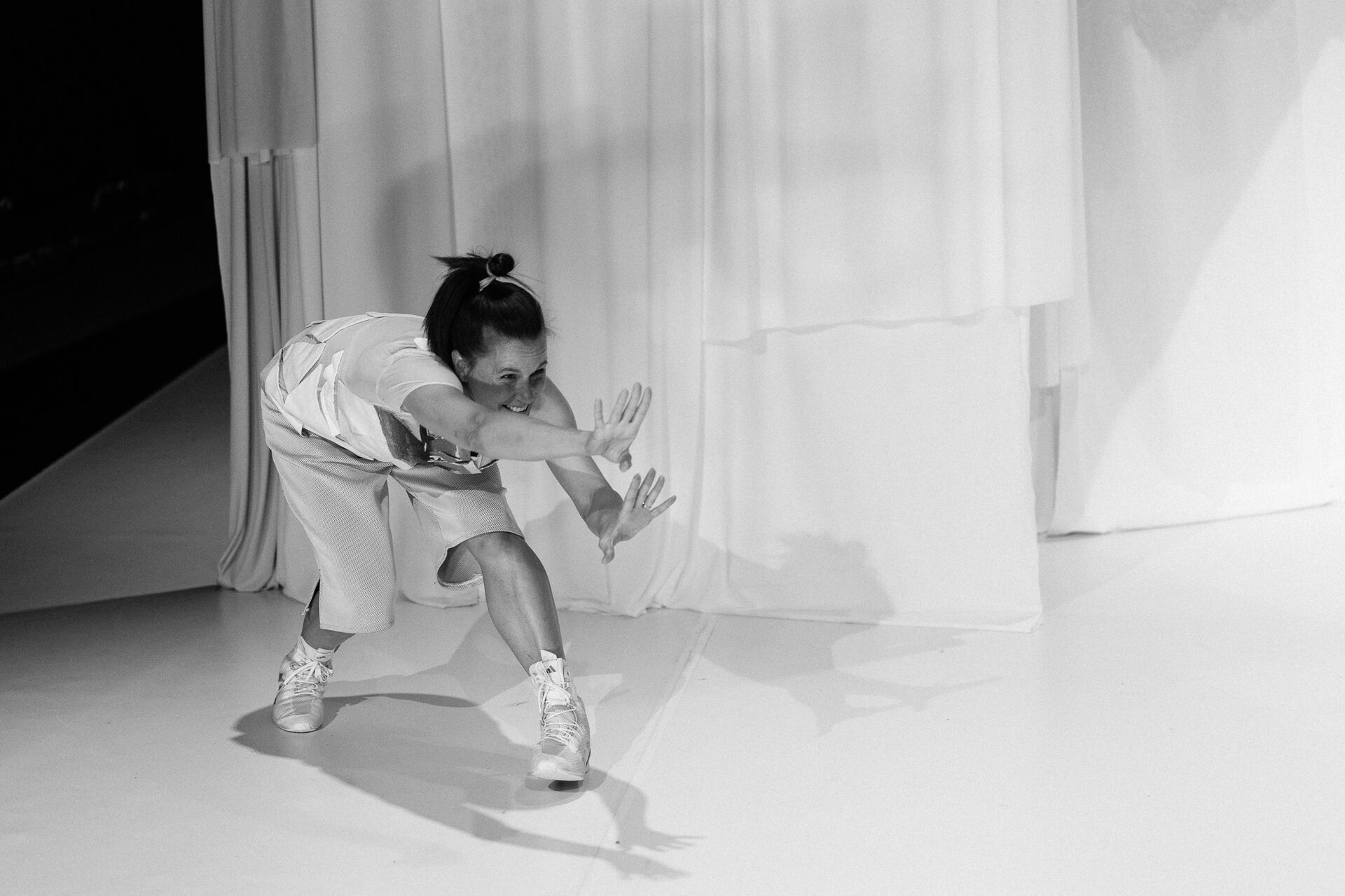 Ve druhé části inscenace se pohybová kvalita proměňuje a působí znatelně uvolněněji. Choreografický materiál se rozvíjí v rovině fyzického odpoutávání a postupného uvědomování si nároku na vlastní prostor. Interpretka jako by hledala stabilitu v těžišti i v kontaktu se zemí: zkoumá okraje chodidel, lehce poskakuje a nechává gesto expandovat do okolí. Její projev vyzařuje lehkost i jistou vnitřní excitaci – připomíná nabuzenou atletku před závodem ve vysokých tretrách, oděnou do autorského kostýmu Natálie Rajnišové.