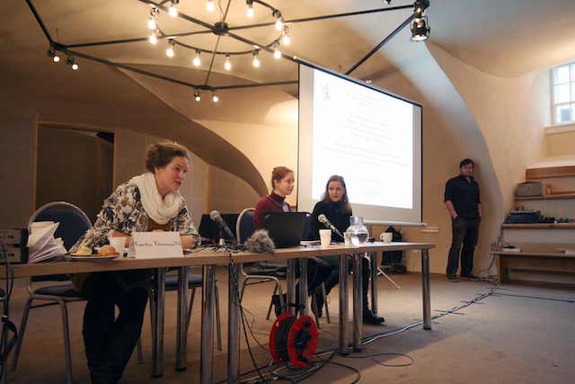 Sylvia Dobalová a Ivan P. Muchka seznámili přítomné s problematikou přesné lokace Pražského zjevení dionýského na Pražském hradě a prostorovými dispozicemi Staré soudní světnice – německy Landstube, dnes známé pod jménem Stará sněmovna, kam je představení ve studii Petra Mati situováno. Autoři poukazovali na malé rozměry sálu 19×13×10,5 m a zdůrazňovali značnou problematičnost prostorových odhadů v členění sálu, neboť podle současných poznatků byl prostor rozdělen v době představení na třetiny. Na závěr se věnovali otázkám interpretace dobových vyobrazení tohoto představení na rytinách.